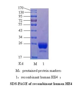 HE4发现于人附睾上皮,是WFDC2基因选择性剪切的产物,具有高度保守的WAP结构域,是由8个半胱氨酸组成的4个二硫键核心区域。本公司提供的HE4为哺乳动物细胞表达的基因重组产品。表达产物纯度高,免疫原性和生物活性都非常好。用此蛋白制备的抗体可作为卵巢癌早期诊断试剂盒的核心原料,而且该蛋白本身也可以作为校准品来使用。